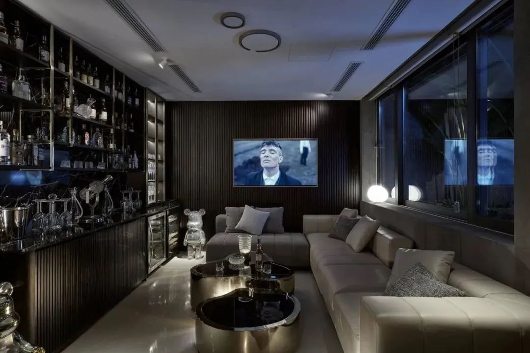 娱乐室应该是每个地下室的标配了,有沙发可以休闲,有电视可以观影,还有超大的酒柜可以调酒和收藏,心情不好的时候可以在这儿看看电影,小酌几杯,放松一下自己。